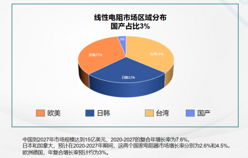 被动元器件一直被视为信息电子时代的工业粮食,高精端到航空航天科技,熟悉到我们日常生活出行所必备的电脑、手机、汽车等皆有涉及。甚至可以说当下生活中几乎所有密切相关产品都需要用到,因此,市场有着巨大的空间前景。被动元件主要分为 RCL 以及射频元器件两大类,是电子电路的基石,主要分为RCL(电阻、电容、电感)以及射频元器件。RCL 约占被动元件总产值的90%,市场规模达到277亿美元,电阻以其可耐潮湿和高温,温度系数小,可以极大节约电路空间成本,实现设计精细化。在整个市场中占有不可或缺的地位,电阻结构较为复杂,生产工序涵盖20多道的工艺。随着中国经济的发展,市场的电子元器件需求逐年增高,以线性电阻为例,以7.6%的速度快速增长。国内2027年市场规模预计可达15亿美元,不过线性电阻和芯片等高尖端电子元件一样,目前全球市场主要是以欧美及韩国三星、日本村田等国外品牌所占据。